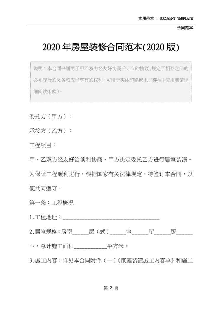 本站正式发布了《2020年房屋装修合同范本(2020版)》文档,文档详细内容可下载阅读。 声明:本站所有文章,如无特殊说明或标注,均为本站原创发布。任何个人或组织,在未征得本站同意时,禁止复制、盗用、采集、发布本站内容到任何网站、书籍等各类媒体平台。如若本站内容侵犯了原著者的合法权益,可联系我们进行处理。