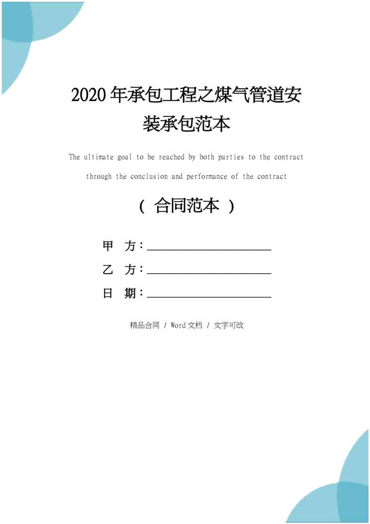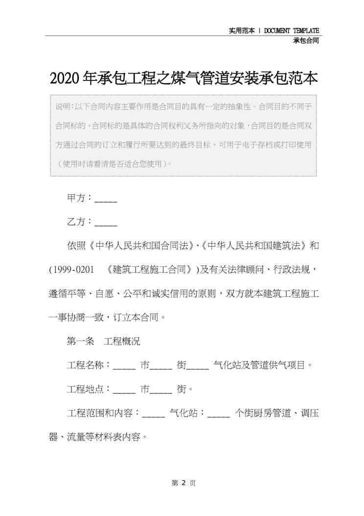 不久前,最新文档《2020年承包工程之煤气管道安装承包范本》全文正式在本站发布,感兴趣的用户可以下载阅读。 声明:本站所有文章,如无特殊说明或标注,均为本站原创发布。任何个人或组织,在未征得本站同意时,禁止复制、盗用、采集、发布本站内容到任何网站、书籍等各类媒体平台。如若本站内容侵犯了原著者的合法权益,可联系我们进行处理。