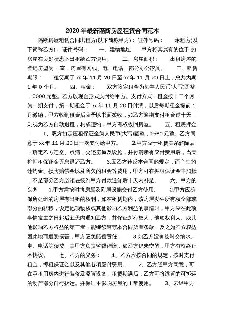 本站资深用户发布了最新的《2020年新版隔断房屋租赁合同范本》文档,以下内容为预览,详细内容可下载阅读。 声明:本站所有文章,如无特殊说明或标注,均为本站原创发布。任何个人或组织,在未征得本站同意时,禁止复制、盗用、采集、发布本站内容到任何网站、书籍等各类媒体平台。如若本站内容侵犯了原著者的合法权益,可联系我们进行处理。