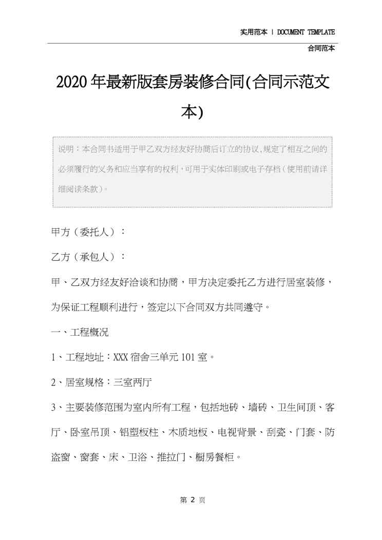 本站正式发布了《2020年最新版套房装修合同(合同示范文本)》文档,文档详细内容可下载阅读。 声明:本站所有文章,如无特殊说明或标注,均为本站原创发布。任何个人或组织,在未征得本站同意时,禁止复制、盗用、采集、发布本站内容到任何网站、书籍等各类媒体平台。如若本站内容侵犯了原著者的合法权益,可联系我们进行处理。