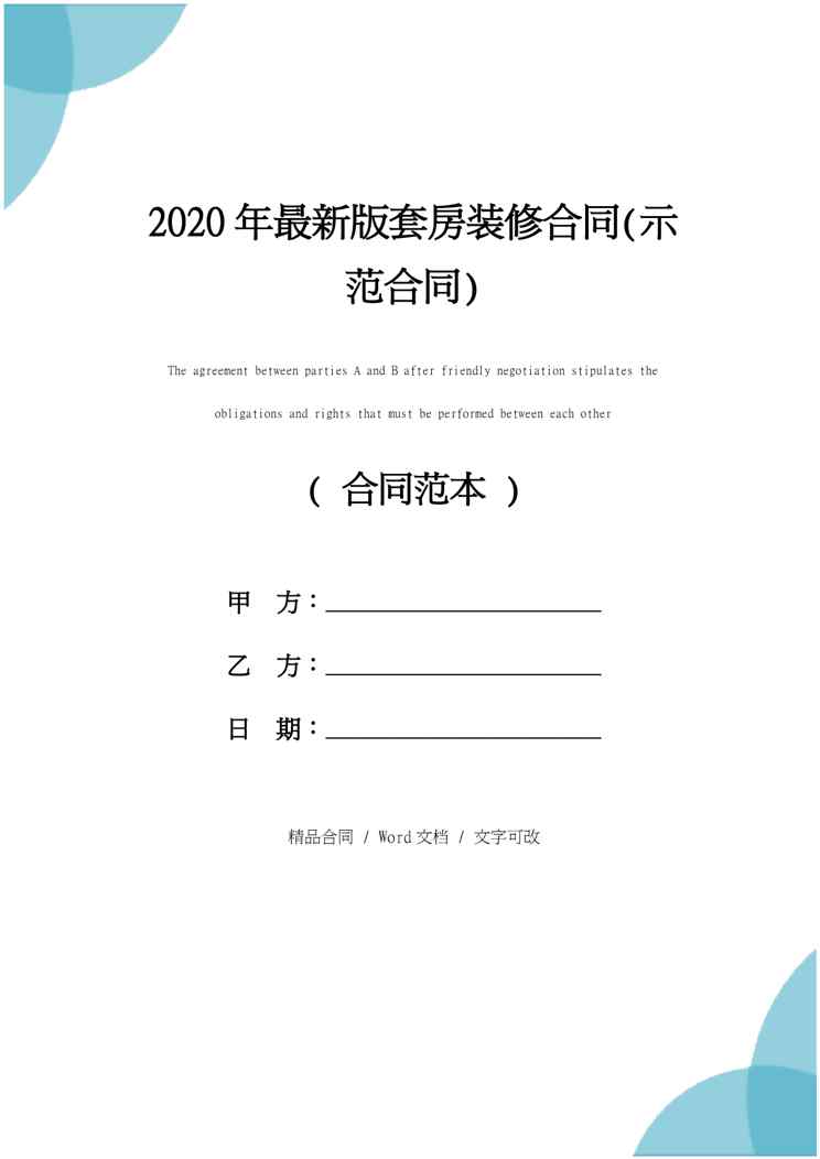 不久前,最新文档《2020年最新版套房装修合同(示范合同)》全文正式在本站发布,感兴趣的用户可以下载阅读。 声明:本站所有文章,如无特殊说明或标注,均为本站原创发布。任何个人或组织,在未征得本站同意时,禁止复制、盗用、采集、发布本站内容到任何网站、书籍等各类媒体平台。如若本站内容侵犯了原著者的合法权益,可联系我们进行处理。