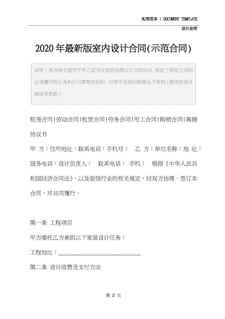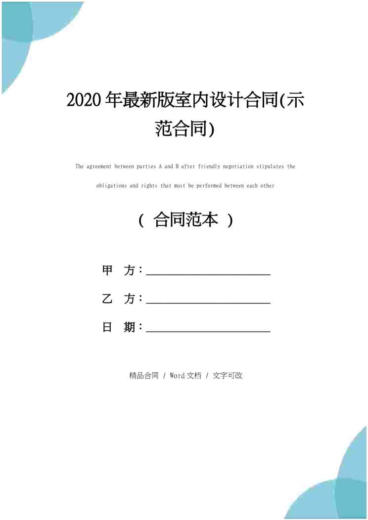 本站正式发布了《2020年最新版室内设计合同(示范合同)》文档,文档详细内容可下载阅读。 声明:本站所有文章,如无特殊说明或标注,均为本站原创发布。任何个人或组织,在未征得本站同意时,禁止复制、盗用、采集、发布本站内容到任何网站、书籍等各类媒体平台。如若本站内容侵犯了原著者的合法权益,可联系我们进行处理。