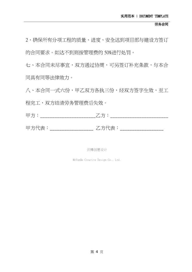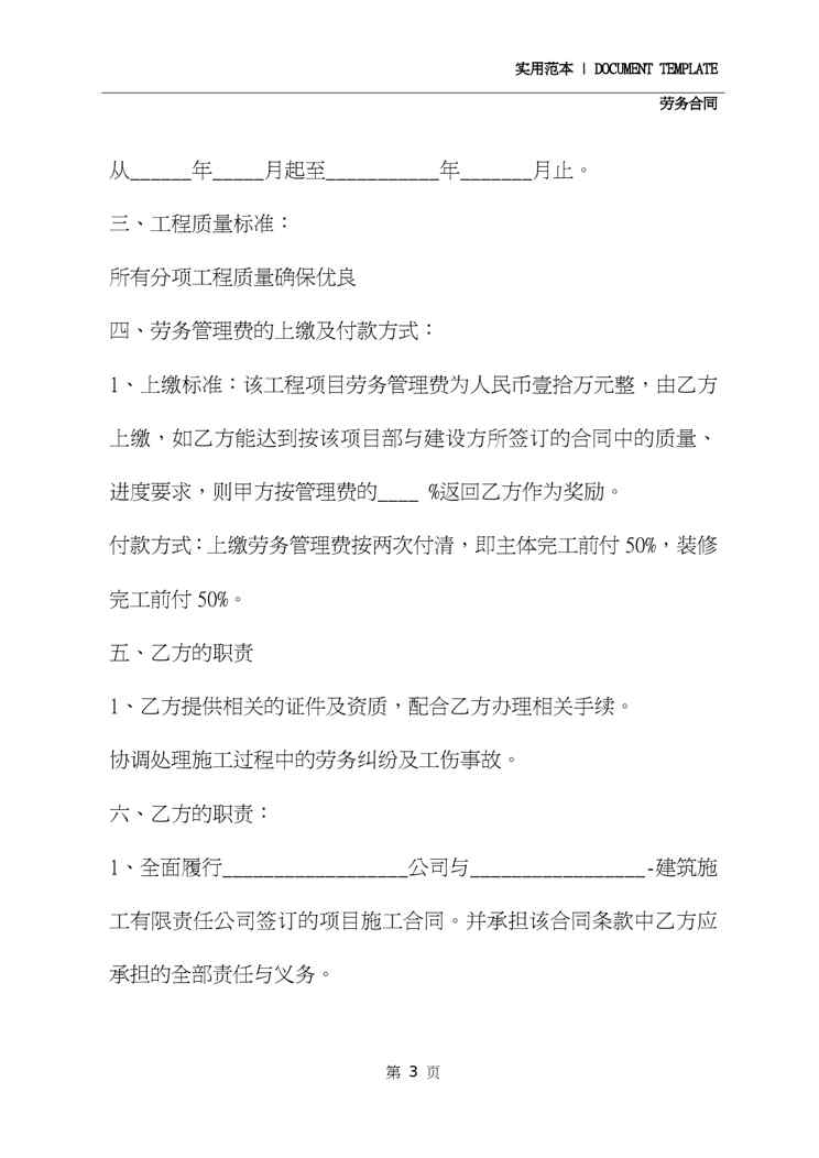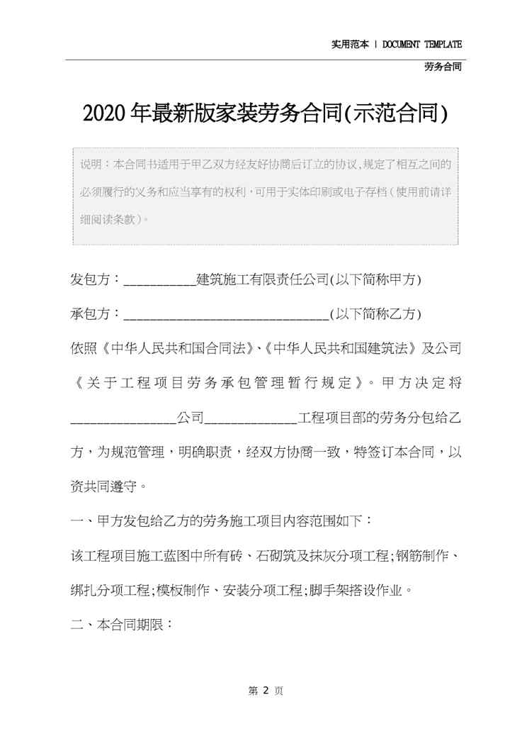 本站资深用户发布了最新的《2020年最新版家装劳务合同(示范合同)》文档,以下内容为预览,详细内容可下载阅读。 声明:本站所有文章,如无特殊说明或标注,均为本站原创发布。任何个人或组织,在未征得本站同意时,禁止复制、盗用、采集、发布本站内容到任何网站、书籍等各类媒体平台。如若本站内容侵犯了原著者的合法权益,可联系我们进行处理。