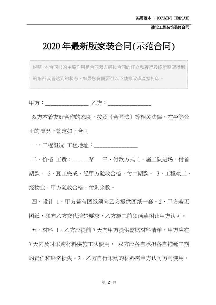 本站资深用户发布了最新的《2020年最新版家装合同(示范合同)》文档,以下内容为预览,详细内容可下载阅读。 声明:本站所有文章,如无特殊说明或标注,均为本站原创发布。任何个人或组织,在未征得本站同意时,禁止复制、盗用、采集、发布本站内容到任何网站、书籍等各类媒体平台。如若本站内容侵犯了原著者的合法权益,可联系我们进行处理。