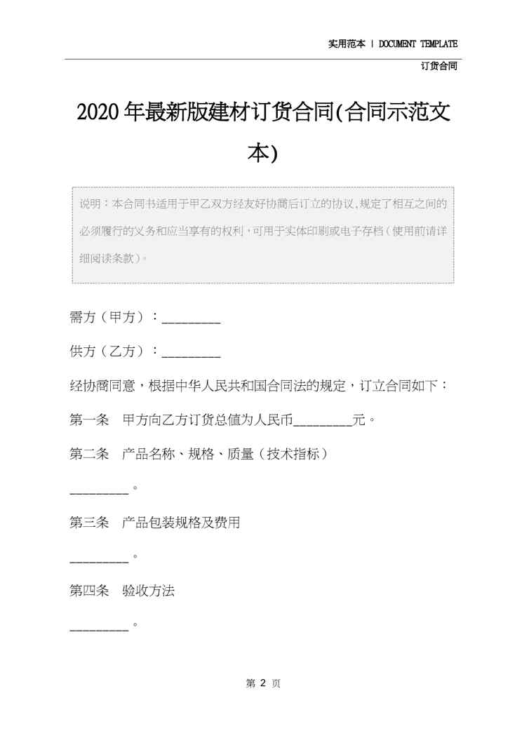 不久前,最新文档《2020年最新版建材订货合同(合同示范文本)》全文正式在本站发布,感兴趣的用户可以下载阅读。 声明:本站所有文章,如无特殊说明或标注,均为本站原创发布。任何个人或组织,在未征得本站同意时,禁止复制、盗用、采集、发布本站内容到任何网站、书籍等各类媒体平台。如若本站内容侵犯了原著者的合法权益,可联系我们进行处理。