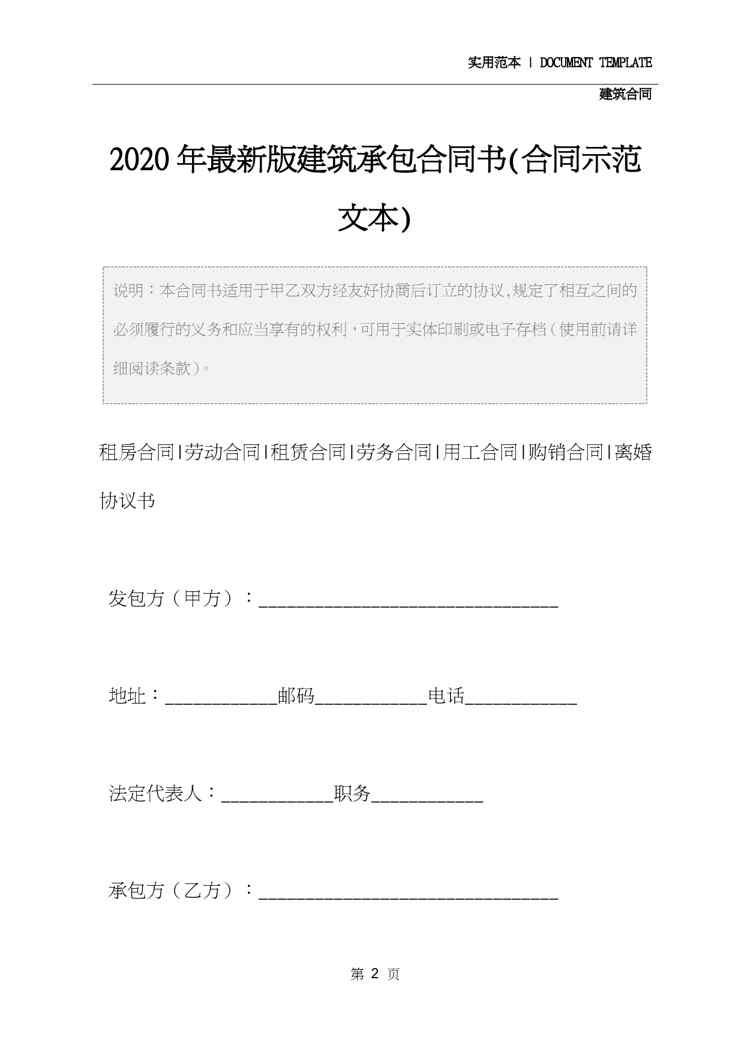 2020年最新版建筑承包合同书(合同示范文本)2020年最新版建筑承包合同书(合同示范文本)2020年最新版建筑承包合同书(合同示范文本)2020年最新版建筑承包合同书(合同示范文本)2020年最新版建筑承包合同书(合同示范文本)