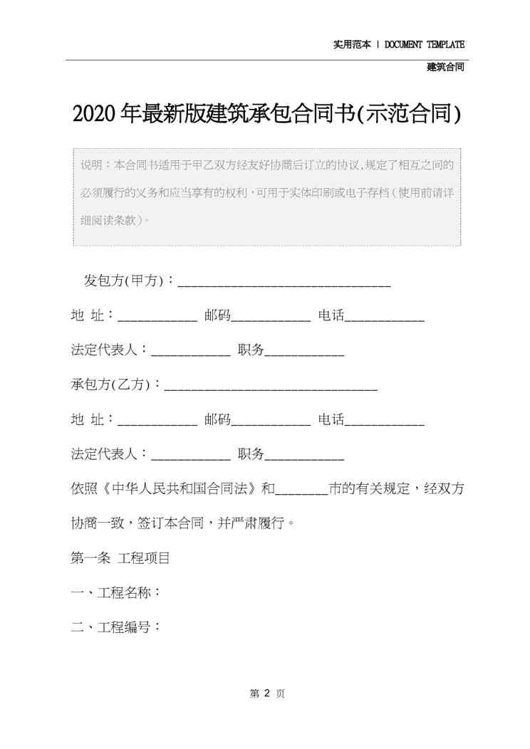 不久前,最新文档《2020年最新版建筑承包合同书(示范合同)》全文正式在本站发布,感兴趣的用户可以下载阅读。 声明:本站所有文章,如无特殊说明或标注,均为本站原创发布。任何个人或组织,在未征得本站同意时,禁止复制、盗用、采集、发布本站内容到任何网站、书籍等各类媒体平台。如若本站内容侵犯了原著者的合法权益,可联系我们进行处理。