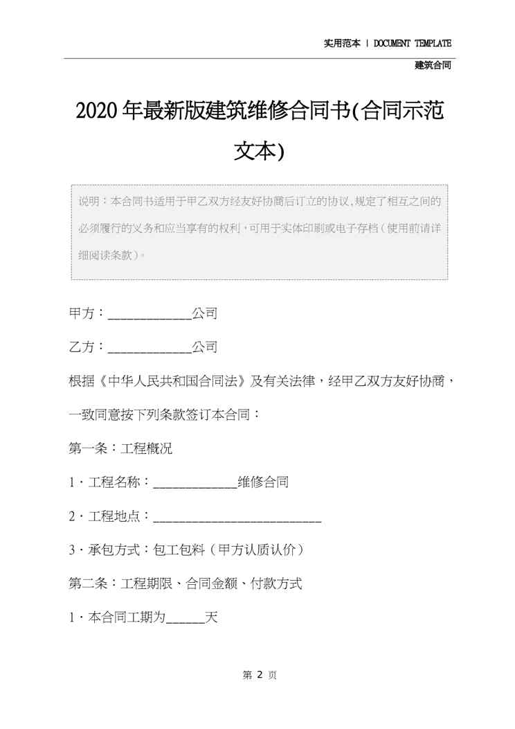 本站资深用户发布了最新的《2020年最新版建筑维修合同书(合同示范文本)》文档,以下内容为预览,详细内容可下载阅读。 声明:本站所有文章,如无特殊说明或标注,均为本站原创发布。任何个人或组织,在未征得本站同意时,禁止复制、盗用、采集、发布本站内容到任何网站、书籍等各类媒体平台。如若本站内容侵犯了原著者的合法权益,可联系我们进行处理。