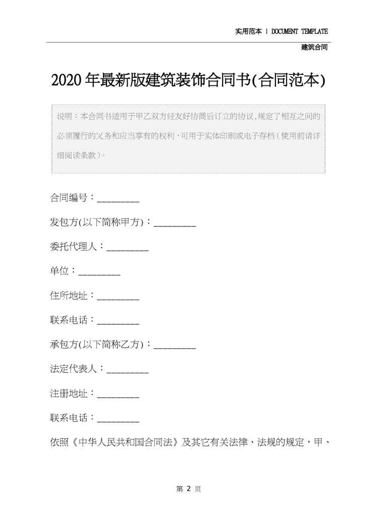 不久前,最新文档《2020年最新版建筑装饰合同书(合同范本)》全文正式在本站发布,感兴趣的用户可以下载阅读。 声明:本站所有文章,如无特殊说明或标注,均为本站原创发布。任何个人或组织,在未征得本站同意时,禁止复制、盗用、采集、发布本站内容到任何网站、书籍等各类媒体平台。如若本站内容侵犯了原著者的合法权益,可联系我们进行处理。