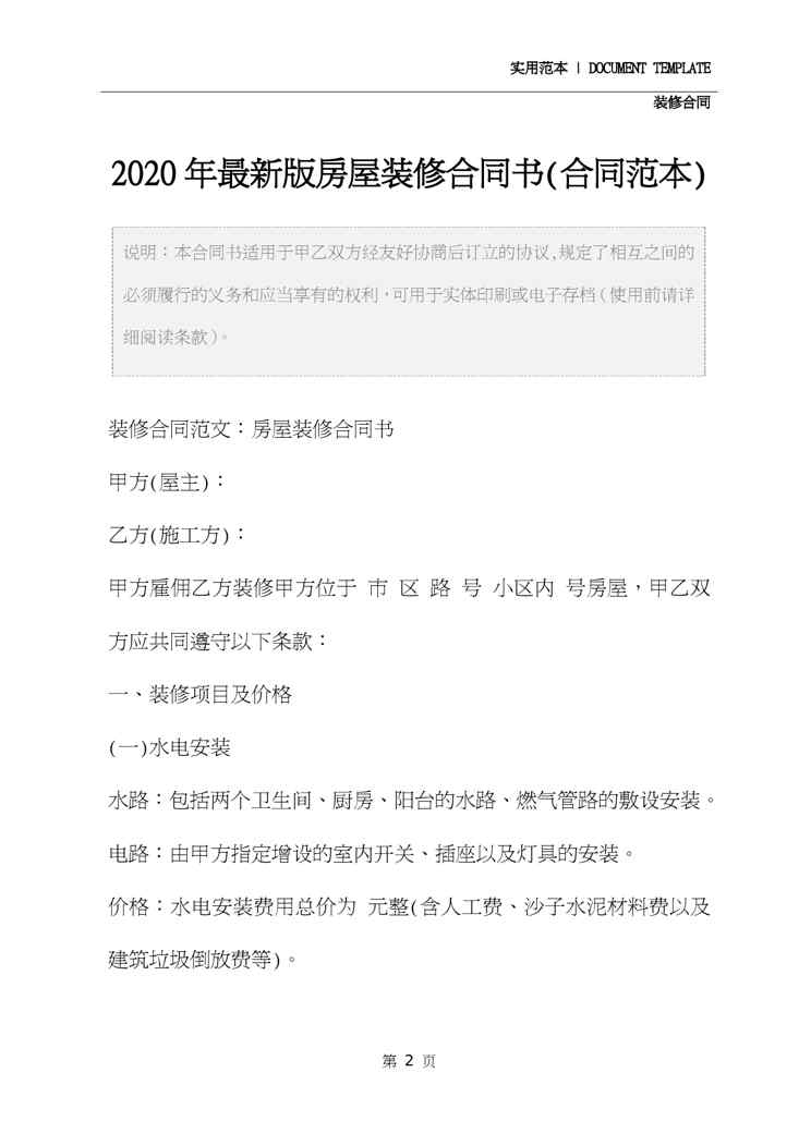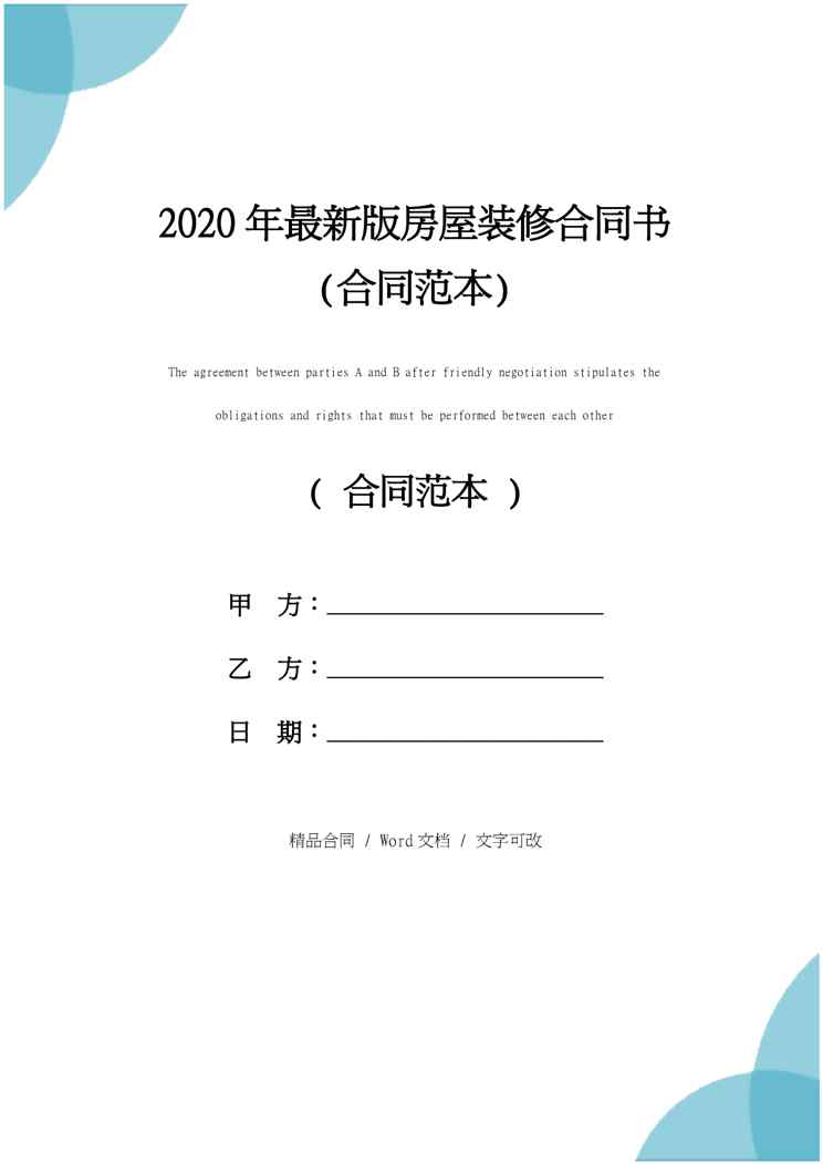 不久前,最新文档《2020年最新版房屋装修合同书(合同范本)》全文正式在本站发布,感兴趣的用户可以下载阅读。 声明:本站所有文章,如无特殊说明或标注,均为本站原创发布。任何个人或组织,在未征得本站同意时,禁止复制、盗用、采集、发布本站内容到任何网站、书籍等各类媒体平台。如若本站内容侵犯了原著者的合法权益,可联系我们进行处理。