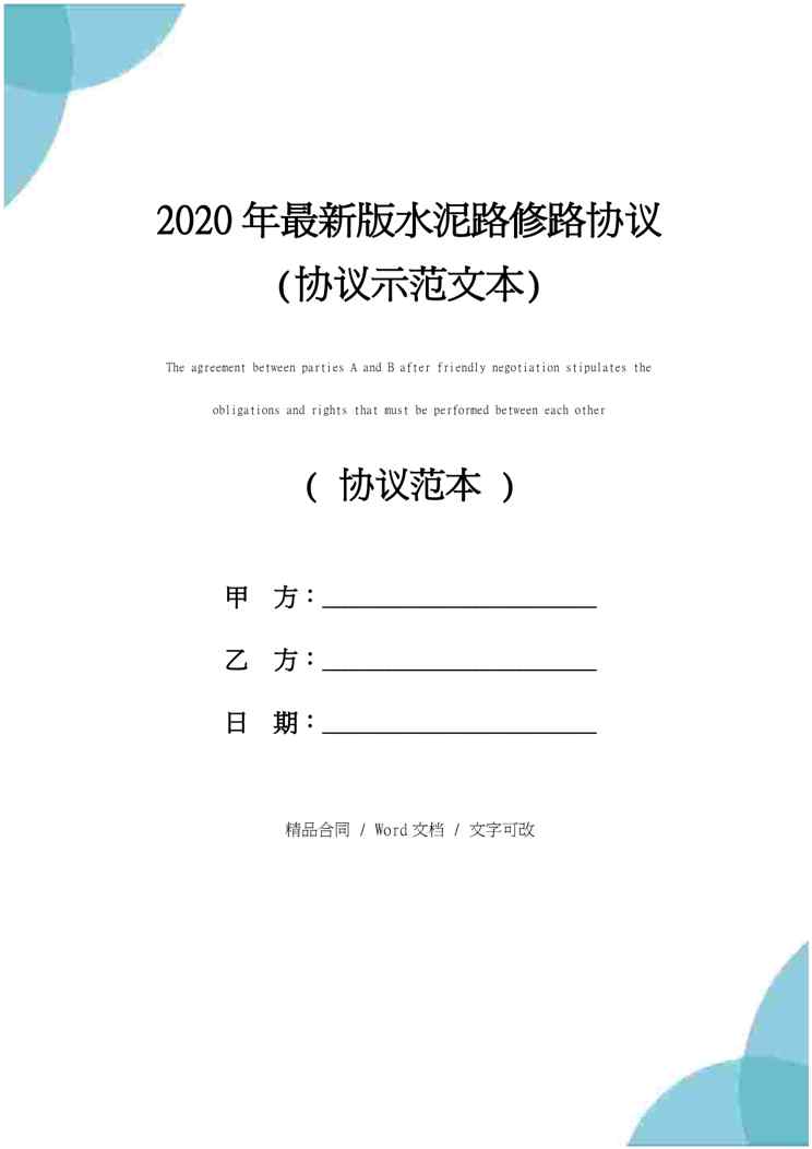 本站正式发布了《2020年最新版水泥路修路协议(协议示范文本)》文档,文档详细内容可下载阅读。 声明:本站所有文章,如无特殊说明或标注,均为本站原创发布。任何个人或组织,在未征得本站同意时,禁止复制、盗用、采集、发布本站内容到任何网站、书籍等各类媒体平台。如若本站内容侵犯了原著者的合法权益,可联系我们进行处理。