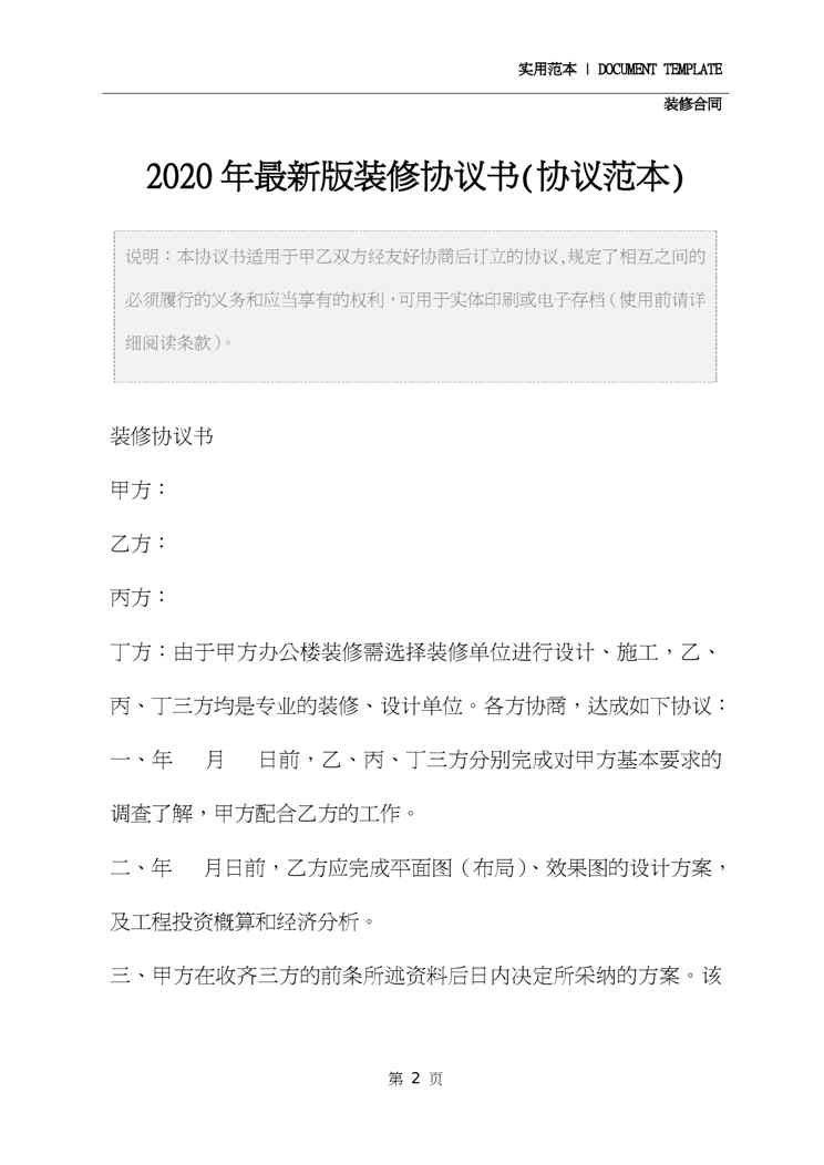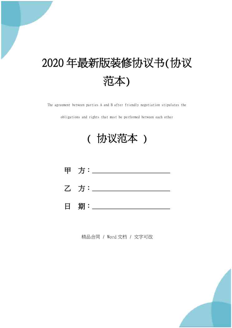 不久前,最新文档《2020年最新版装修协议书(协议范本)》全文正式在本站发布,感兴趣的用户可以下载阅读。 声明:本站所有文章,如无特殊说明或标注,均为本站原创发布。任何个人或组织,在未征得本站同意时,禁止复制、盗用、采集、发布本站内容到任何网站、书籍等各类媒体平台。如若本站内容侵犯了原著者的合法权益,可联系我们进行处理。