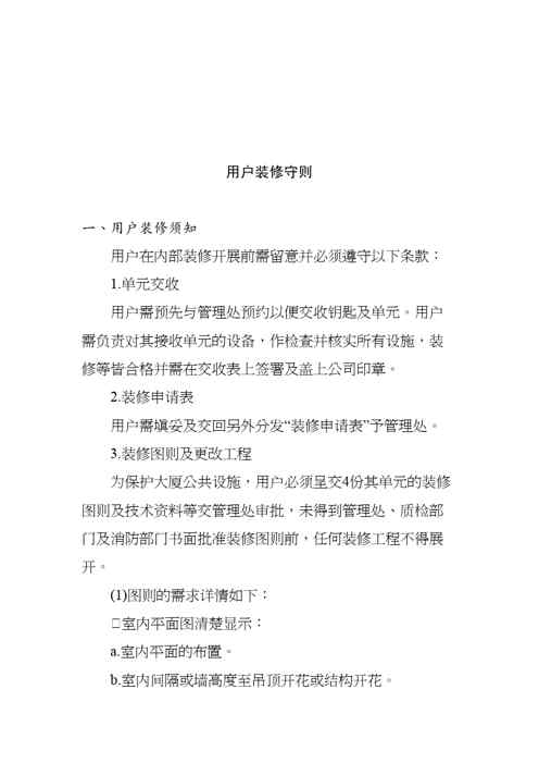 本站资深用户发布了最新的《{企业管理手册}用户装修管理手册》文档,以下内容为预览,详细内容可下载阅读。