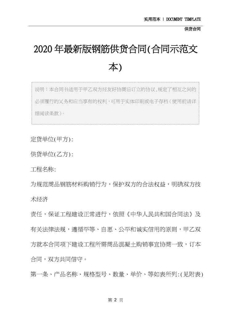 本站正式发布了《2020年最新版钢筋供货合同(合同示范文本)》文档,文档详细内容可下载阅读。 声明:本站所有文章,如无特殊说明或标注,均为本站原创发布。任何个人或组织,在未征得本站同意时,禁止复制、盗用、采集、发布本站内容到任何网站、书籍等各类媒体平台。如若本站内容侵犯了原著者的合法权益,可联系我们进行处理。