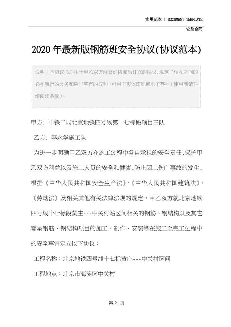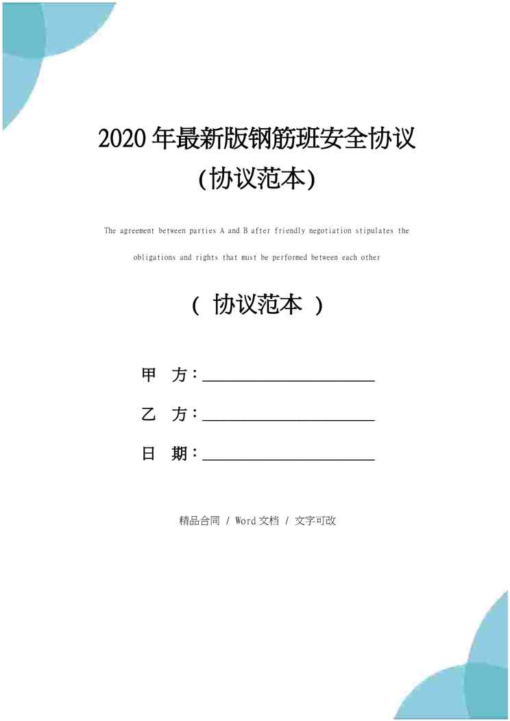 不久前,最新文档《2020年最新版钢筋班安全协议(协议范本)》全文正式在本站发布,感兴趣的用户可以下载阅读。 声明:本站所有文章,如无特殊说明或标注,均为本站原创发布。任何个人或组织,在未征得本站同意时,禁止复制、盗用、采集、发布本站内容到任何网站、书籍等各类媒体平台。如若本站内容侵犯了原著者的合法权益,可联系我们进行处理。