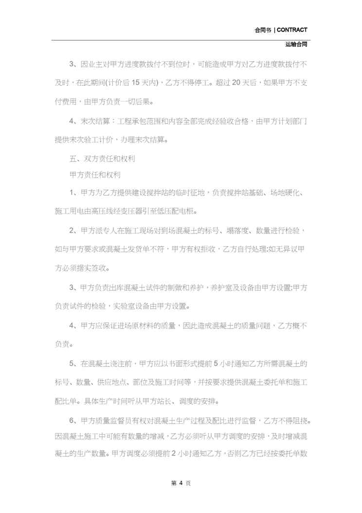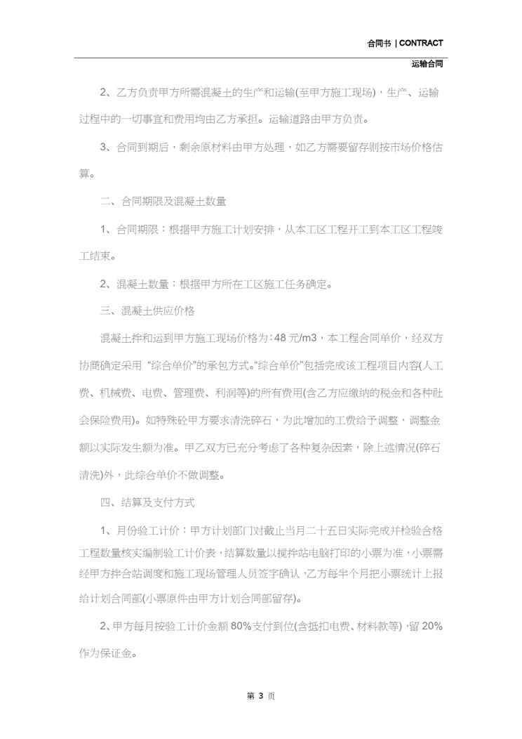 不久前,最新文档《2020年水泥罐车运输合同样本(合同范本)》全文正式在本站发布,感兴趣的用户可以下载阅读。 声明:本站所有文章,如无特殊说明或标注,均为本站原创发布。任何个人或组织,在未征得本站同意时,禁止复制、盗用、采集、发布本站内容到任何网站、书籍等各类媒体平台。如若本站内容侵犯了原著者的合法权益,可联系我们进行处理。