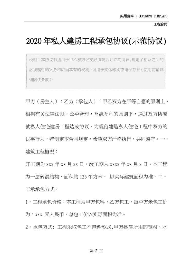 本站资深用户发布了最新的《2020年私人建房工程承包协议(示范协议)》文档,以下内容为预览,详细内容可下载阅读。 声明:本站所有文章,如无特殊说明或标注,均为本站原创发布。任何个人或组织,在未征得本站同意时,禁止复制、盗用、采集、发布本站内容到任何网站、书籍等各类媒体平台。如若本站内容侵犯了原著者的合法权益,可联系我们进行处理。
