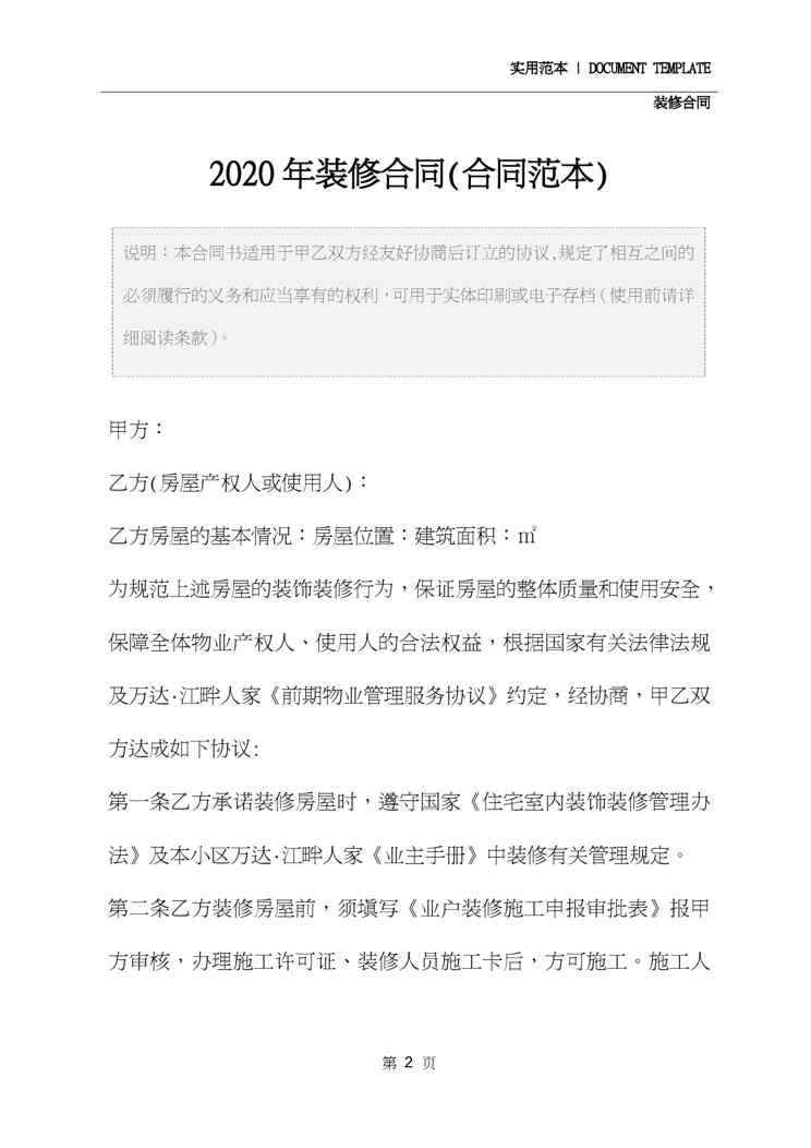 不久前,最新文档《2020年装修合同(合同范本)》全文正式在本站发布,感兴趣的用户可以下载阅读。 声明:本站所有文章,如无特殊说明或标注,均为本站原创发布。任何个人或组织,在未征得本站同意时,禁止复制、盗用、采集、发布本站内容到任何网站、书籍等各类媒体平台。如若本站内容侵犯了原著者的合法权益,可联系我们进行处理。