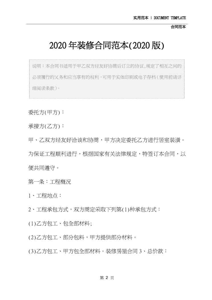 本站正式发布了《2020年装修合同范本(2020版)》文档,文档详细内容可下载阅读。 声明:本站所有文章,如无特殊说明或标注,均为本站原创发布。任何个人或组织,在未征得本站同意时,禁止复制、盗用、采集、发布本站内容到任何网站、书籍等各类媒体平台。如若本站内容侵犯了原著者的合法权益,可联系我们进行处理。
