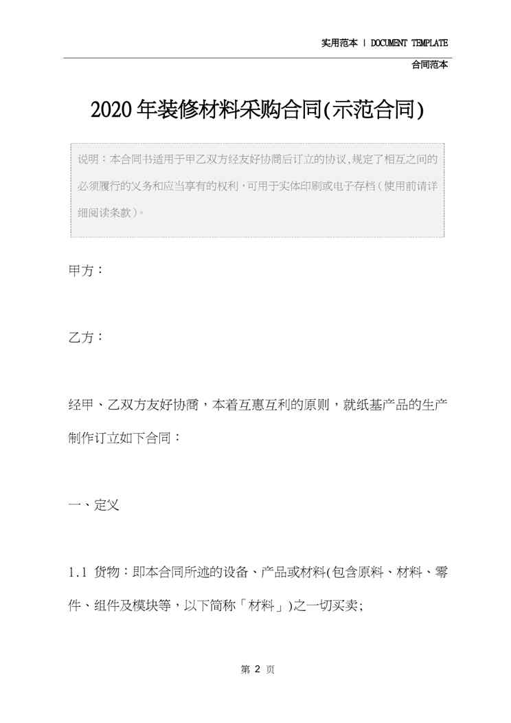 本站正式发布了《2020年装修材料采购合同(示范合同)》文档,文档详细内容可下载阅读。 声明:本站所有文章,如无特殊说明或标注,均为本站原创发布。任何个人或组织,在未征得本站同意时,禁止复制、盗用、采集、发布本站内容到任何网站、书籍等各类媒体平台。如若本站内容侵犯了原著者的合法权益,可联系我们进行处理。