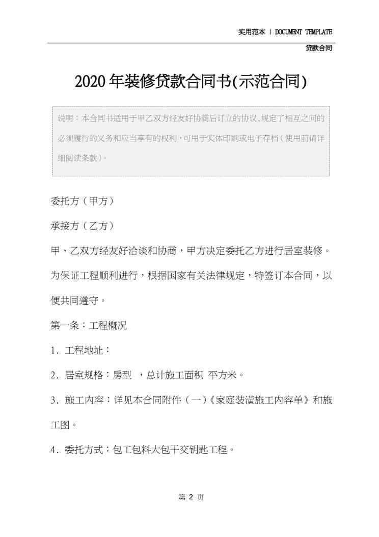 不久前,最新文档《2020年装修贷款合同书(示范合同)》全文正式在本站发布,感兴趣的用户可以下载阅读。 声明:本站所有文章,如无特殊说明或标注,均为本站原创发布。任何个人或组织,在未征得本站同意时,禁止复制、盗用、采集、发布本站内容到任何网站、书籍等各类媒体平台。如若本站内容侵犯了原著者的合法权益,可联系我们进行处理。