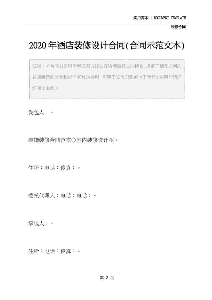 本站正式发布了《2020年酒店装修设计合同(合同示范文本)》文档,文档详细内容可下载阅读。 声明:本站所有文章,如无特殊说明或标注,均为本站原创发布。任何个人或组织,在未征得本站同意时,禁止复制、盗用、采集、发布本站内容到任何网站、书籍等各类媒体平台。如若本站内容侵犯了原著者的合法权益,可联系我们进行处理。