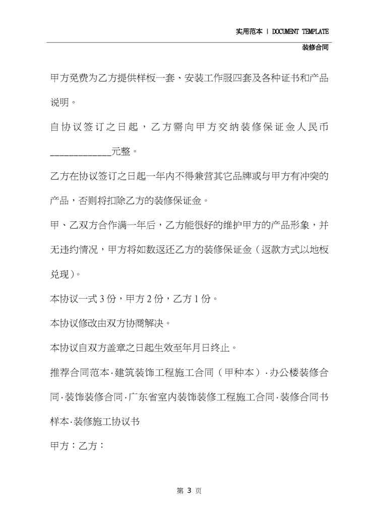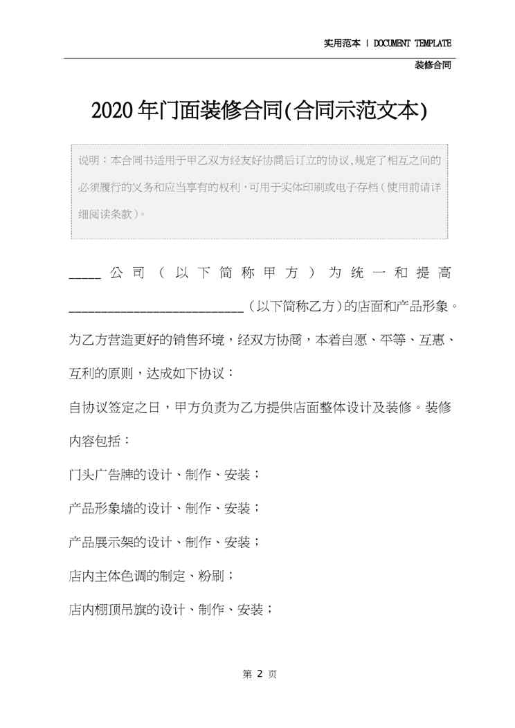 本站正式发布了《2020年门面装修合同(合同示范文本)》文档,文档详细内容可下载阅读。 声明:本站所有文章,如无特殊说明或标注,均为本站原创发布。任何个人或组织,在未征得本站同意时,禁止复制、盗用、采集、发布本站内容到任何网站、书籍等各类媒体平台。如若本站内容侵犯了原著者的合法权益,可联系我们进行处理。