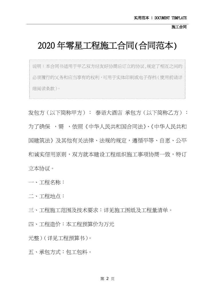 本站资深用户发布了最新的《2020年零星工程施工合同(合同范本)》文档,以下内容为预览,详细内容可下载阅读。 声明:本站所有文章,如无特殊说明或标注,均为本站原创发布。任何个人或组织,在未征得本站同意时,禁止复制、盗用、采集、发布本站内容到任何网站、书籍等各类媒体平台。如若本站内容侵犯了原著者的合法权益,可联系我们进行处理。
