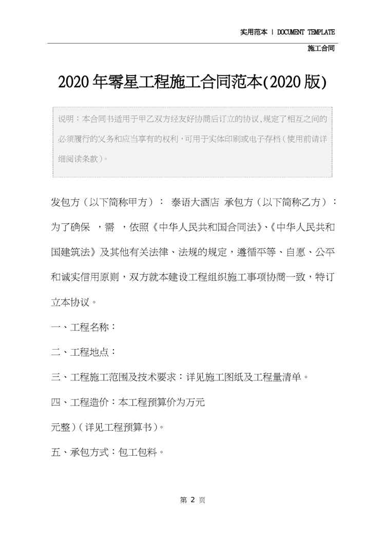 不久前,最新文档《2020年零星工程施工合同范本(2020版)》全文正式在本站发布,感兴趣的用户可以下载阅读。 声明:本站所有文章,如无特殊说明或标注,均为本站原创发布。任何个人或组织,在未征得本站同意时,禁止复制、盗用、采集、发布本站内容到任何网站、书籍等各类媒体平台。如若本站内容侵犯了原著者的合法权益,可联系我们进行处理。