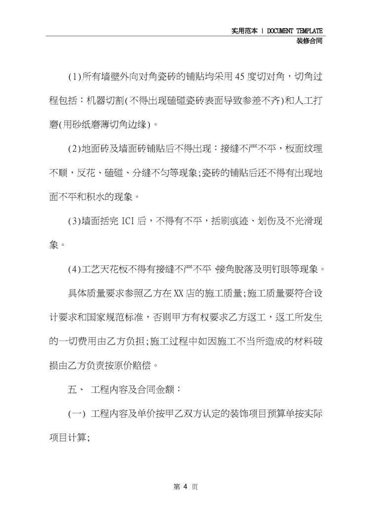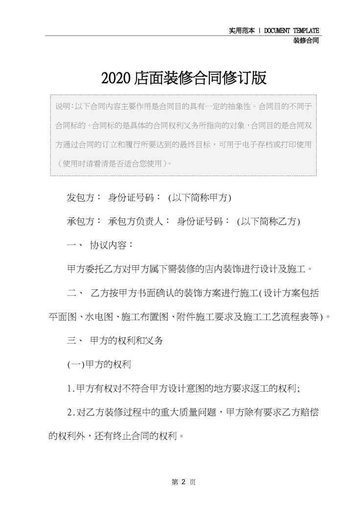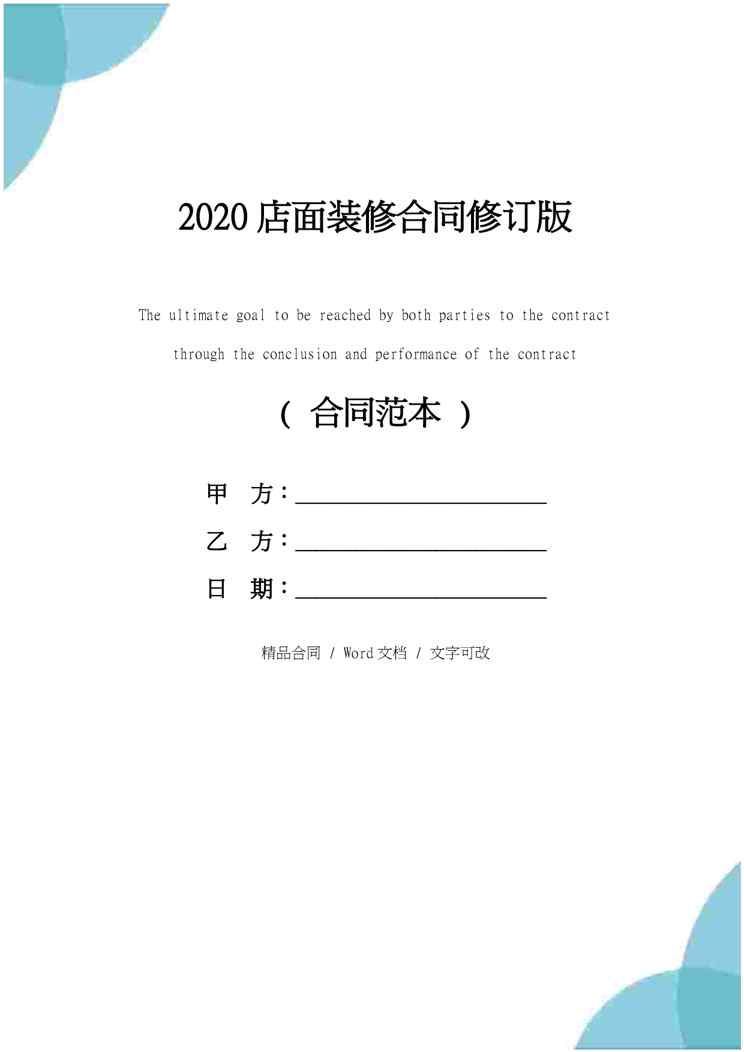 本站资深用户发布了最新的《2020店面装修合同修订版》文档,以下内容为预览,详细内容可下载阅读。 声明:本站所有文章,如无特殊说明或标注,均为本站原创发布。任何个人或组织,在未征得本站同意时,禁止复制、盗用、采集、发布本站内容到任何网站、书籍等各类媒体平台。如若本站内容侵犯了原著者的合法权益,可联系我们进行处理。
