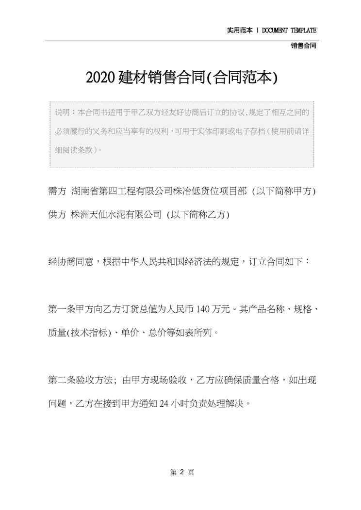 不久前,最新文档《2020建材销售合同(合同范本)》全文正式在本站发布,感兴趣的用户可以下载阅读。 声明:本站所有文章,如无特殊说明或标注,均为本站原创发布。任何个人或组织,在未征得本站同意时,禁止复制、盗用、采集、发布本站内容到任何网站、书籍等各类媒体平台。如若本站内容侵犯了原著者的合法权益,可联系我们进行处理。