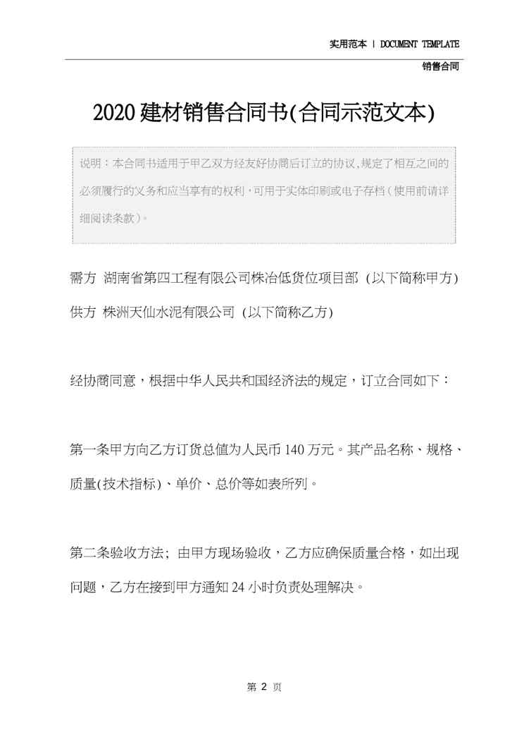 不久前,最新文档《2020建材销售合同书(合同示范文本)》全文正式在本站发布,感兴趣的用户可以下载阅读。 声明:本站所有文章,如无特殊说明或标注,均为本站原创发布。任何个人或组织,在未征得本站同意时,禁止复制、盗用、采集、发布本站内容到任何网站、书籍等各类媒体平台。如若本站内容侵犯了原著者的合法权益,可联系我们进行处理。