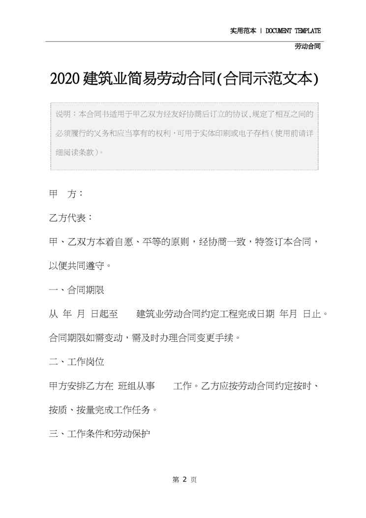 本站资深用户发布了最新的《2020建筑业简易劳动合同(合同示范文本)》文档,以下内容为预览,详细内容可下载阅读。 声明:本站所有文章,如无特殊说明或标注,均为本站原创发布。任何个人或组织,在未征得本站同意时,禁止复制、盗用、采集、发布本站内容到任何网站、书籍等各类媒体平台。如若本站内容侵犯了原著者的合法权益,可联系我们进行处理。