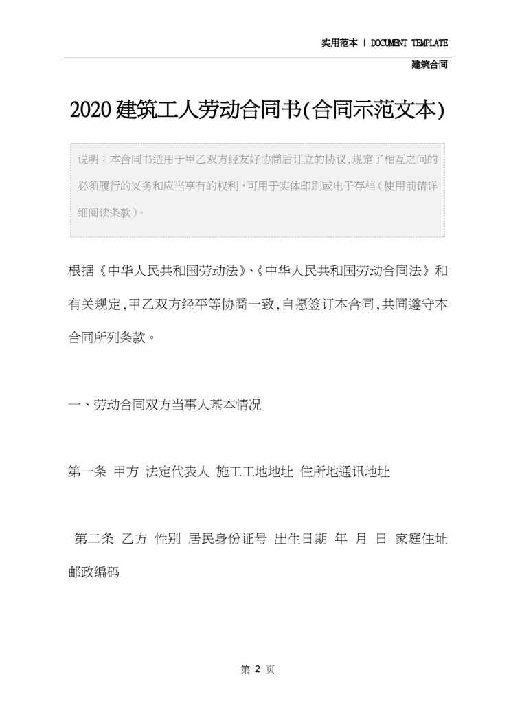 本站正式发布了《2020建筑工人劳动合同书(合同示范文本)》文档,文档详细内容可下载阅读。 声明:本站所有文章,如无特殊说明或标注,均为本站原创发布。任何个人或组织,在未征得本站同意时,禁止复制、盗用、采集、发布本站内容到任何网站、书籍等各类媒体平台。如若本站内容侵犯了原著者的合法权益,可联系我们进行处理。