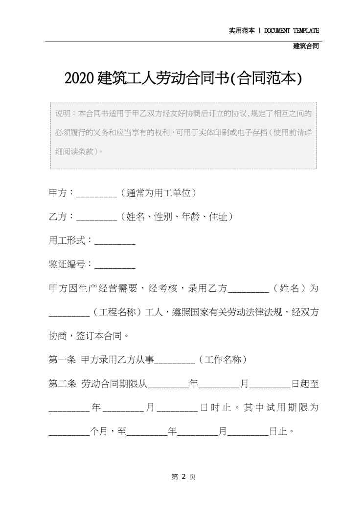 本站正式发布了《2020建筑工人劳动合同书(合同范本)》文档,文档详细内容可下载阅读。 声明:本站所有文章,如无特殊说明或标注,均为本站原创发布。任何个人或组织,在未征得本站同意时,禁止复制、盗用、采集、发布本站内容到任何网站、书籍等各类媒体平台。如若本站内容侵犯了原著者的合法权益,可联系我们进行处理。