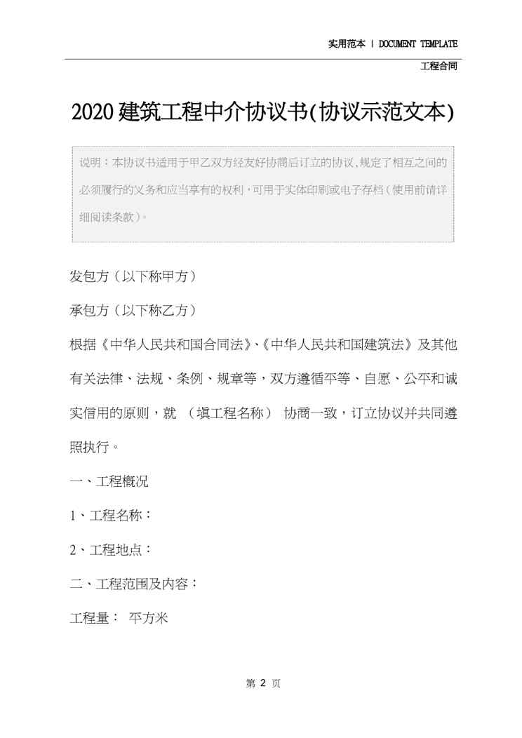 本站正式发布了《2020建筑工程中介协议书(协议示范文本)》文档,文档详细内容可下载阅读。 声明:本站所有文章,如无特殊说明或标注,均为本站原创发布。任何个人或组织,在未征得本站同意时,禁止复制、盗用、采集、发布本站内容到任何网站、书籍等各类媒体平台。如若本站内容侵犯了原著者的合法权益,可联系我们进行处理。
