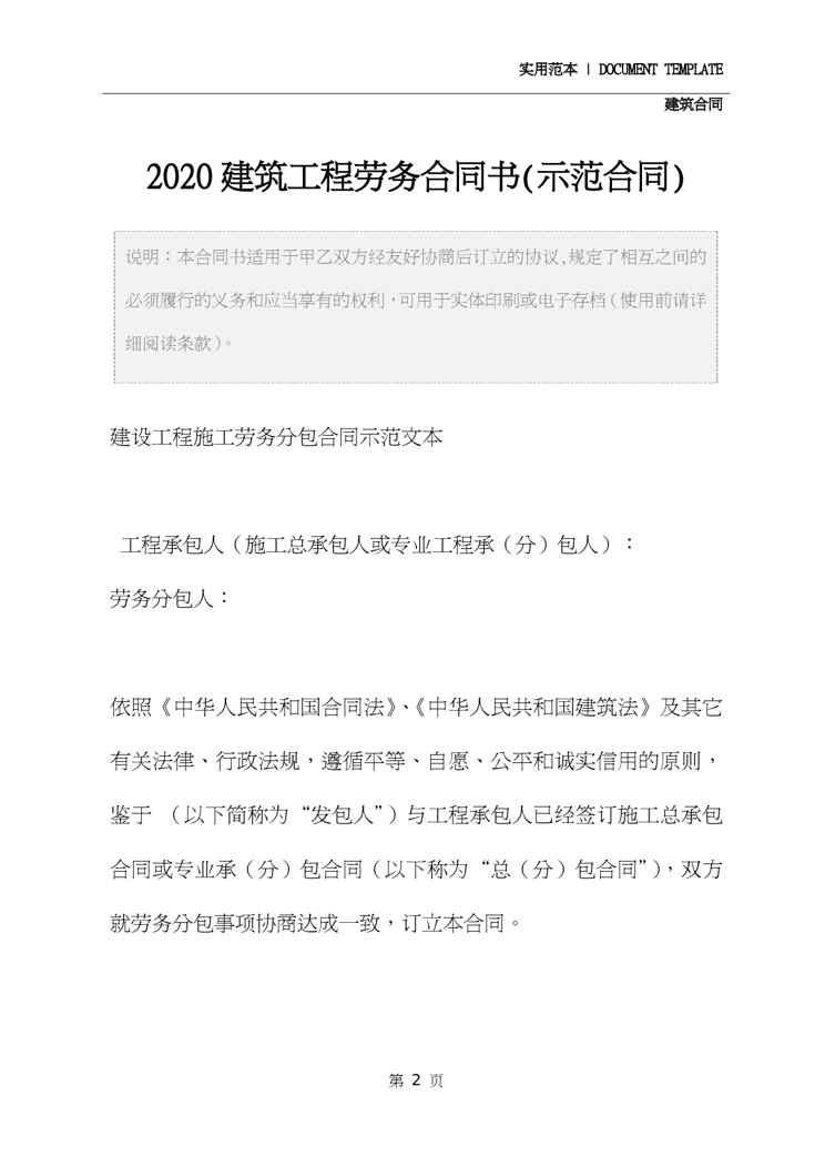 本站资深用户发布了最新的《2020建筑工程劳务合同书(示范合同)》文档,以下内容为预览,详细内容可下载阅读。 声明:本站所有文章,如无特殊说明或标注,均为本站原创发布。任何个人或组织,在未征得本站同意时,禁止复制、盗用、采集、发布本站内容到任何网站、书籍等各类媒体平台。如若本站内容侵犯了原著者的合法权益,可联系我们进行处理。