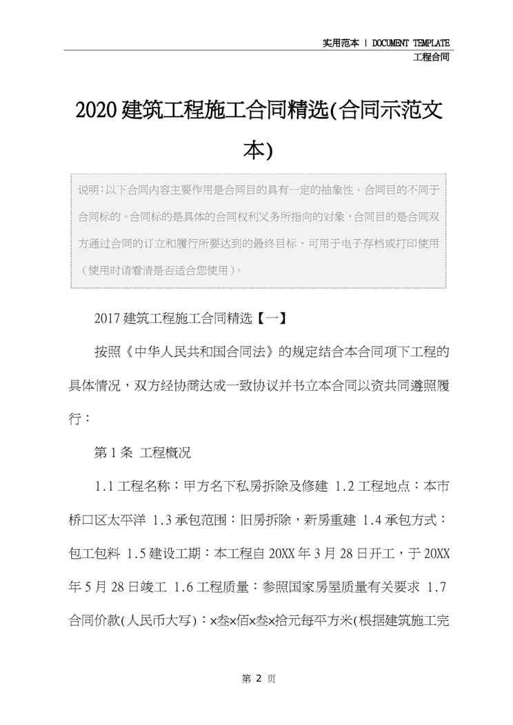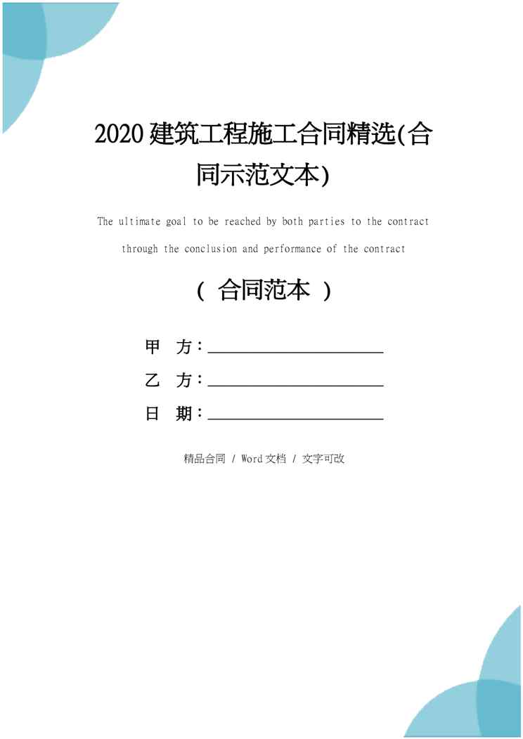 本站资深用户发布了最新的《2020建筑工程施工合同精选(合同示范文本)》文档,以下内容为预览,详细内容可下载阅读。 声明:本站所有文章,如无特殊说明或标注,均为本站原创发布。任何个人或组织,在未征得本站同意时,禁止复制、盗用、采集、发布本站内容到任何网站、书籍等各类媒体平台。如若本站内容侵犯了原著者的合法权益,可联系我们进行处理。
