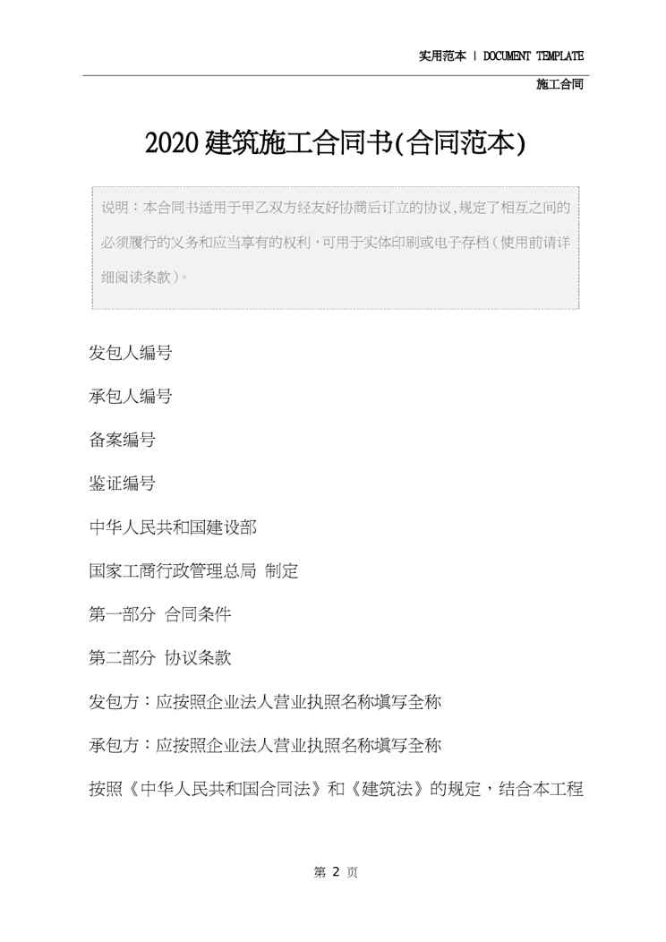 本站正式发布了《2020建筑施工合同书(合同范本)》文档,文档详细内容可下载阅读。 声明:本站所有文章,如无特殊说明或标注,均为本站原创发布。任何个人或组织,在未征得本站同意时,禁止复制、盗用、采集、发布本站内容到任何网站、书籍等各类媒体平台。如若本站内容侵犯了原著者的合法权益,可联系我们进行处理。