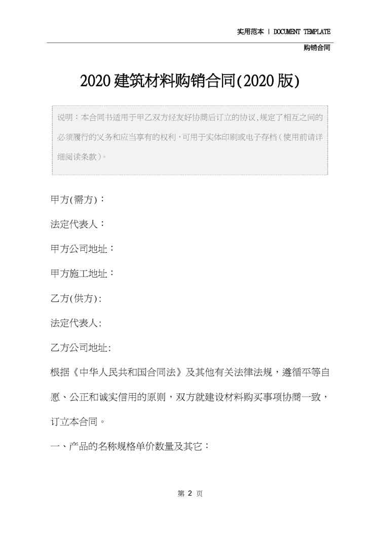 不久前,最新文档《2020建筑材料购销合同(2020版)》全文正式在本站发布,感兴趣的用户可以下载阅读。 声明:本站所有文章,如无特殊说明或标注,均为本站原创发布。任何个人或组织,在未征得本站同意时,禁止复制、盗用、采集、发布本站内容到任何网站、书籍等各类媒体平台。如若本站内容侵犯了原著者的合法权益,可联系我们进行处理。