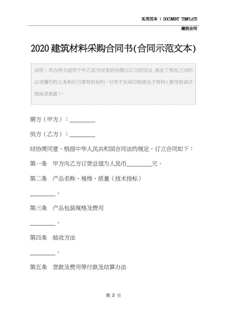 本站资深用户发布了最新的《2020建筑材料采购合同书(合同示范文本)》文档,以下内容为预览,详细内容可下载阅读。 声明:本站所有文章,如无特殊说明或标注,均为本站原创发布。任何个人或组织,在未征得本站同意时,禁止复制、盗用、采集、发布本站内容到任何网站、书籍等各类媒体平台。如若本站内容侵犯了原著者的合法权益,可联系我们进行处理。