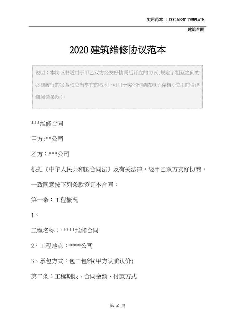 不久前,最新文档《2020建筑维修协议范本》全文正式在本站发布,感兴趣的用户可以下载阅读。 声明:本站所有文章,如无特殊说明或标注,均为本站原创发布。任何个人或组织,在未征得本站同意时,禁止复制、盗用、采集、发布本站内容到任何网站、书籍等各类媒体平台。如若本站内容侵犯了原著者的合法权益,可联系我们进行处理。
