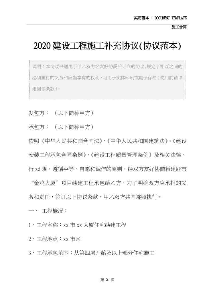 本站资深用户发布了最新的《2020建设工程施工补充协议(协议范本)》文档,以下内容为预览,详细内容可下载阅读。 声明:本站所有文章,如无特殊说明或标注,均为本站原创发布。任何个人或组织,在未征得本站同意时,禁止复制、盗用、采集、发布本站内容到任何网站、书籍等各类媒体平台。如若本站内容侵犯了原著者的合法权益,可联系我们进行处理。
