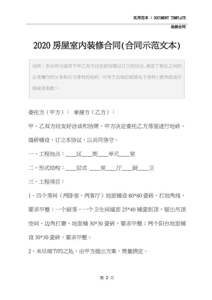 本站资深用户发布了最新的《2020房屋室内装修合同(合同示范文本)》文档,以下内容为预览,详细内容可下载阅读。 声明:本站所有文章,如无特殊说明或标注,均为本站原创发布。任何个人或组织,在未征得本站同意时,禁止复制、盗用、采集、发布本站内容到任何网站、书籍等各类媒体平台。如若本站内容侵犯了原著者的合法权益,可联系我们进行处理。