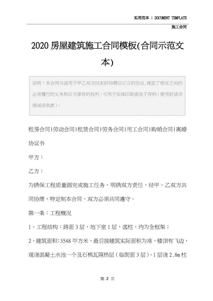 本站资深用户发布了最新的《2020房屋建筑施工合同模板(合同示范文本)》文档,以下内容为预览,详细内容可下载阅读。 声明:本站所有文章,如无特殊说明或标注,均为本站原创发布。任何个人或组织,在未征得本站同意时,禁止复制、盗用、采集、发布本站内容到任何网站、书籍等各类媒体平台。如若本站内容侵犯了原著者的合法权益,可联系我们进行处理。