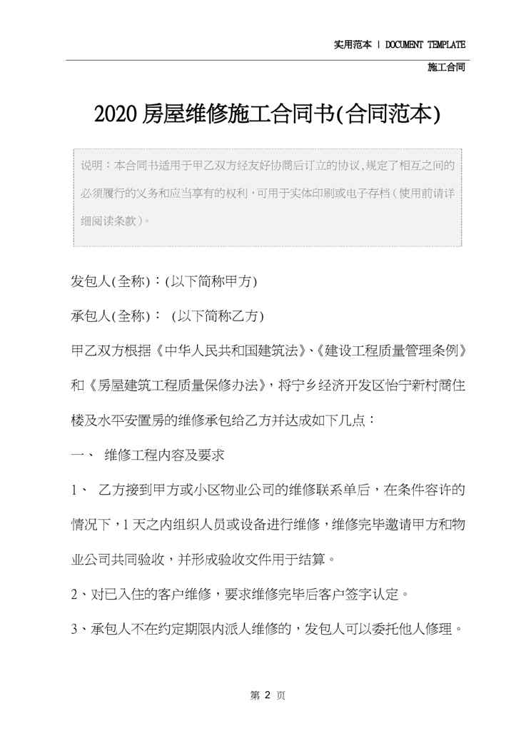 不久前,最新文档《2020房屋维修施工合同书(合同范本)》全文正式在本站发布,感兴趣的用户可以下载阅读。 声明:本站所有文章,如无特殊说明或标注,均为本站原创发布。任何个人或组织,在未征得本站同意时,禁止复制、盗用、采集、发布本站内容到任何网站、书籍等各类媒体平台。如若本站内容侵犯了原著者的合法权益,可联系我们进行处理。