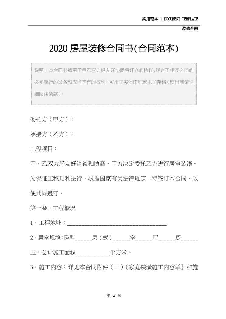 本站正式发布了《2020房屋装修合同书(合同范本)》文档,文档详细内容可下载阅读。 声明:本站所有文章,如无特殊说明或标注,均为本站原创发布。任何个人或组织,在未征得本站同意时,禁止复制、盗用、采集、发布本站内容到任何网站、书籍等各类媒体平台。如若本站内容侵犯了原著者的合法权益,可联系我们进行处理。