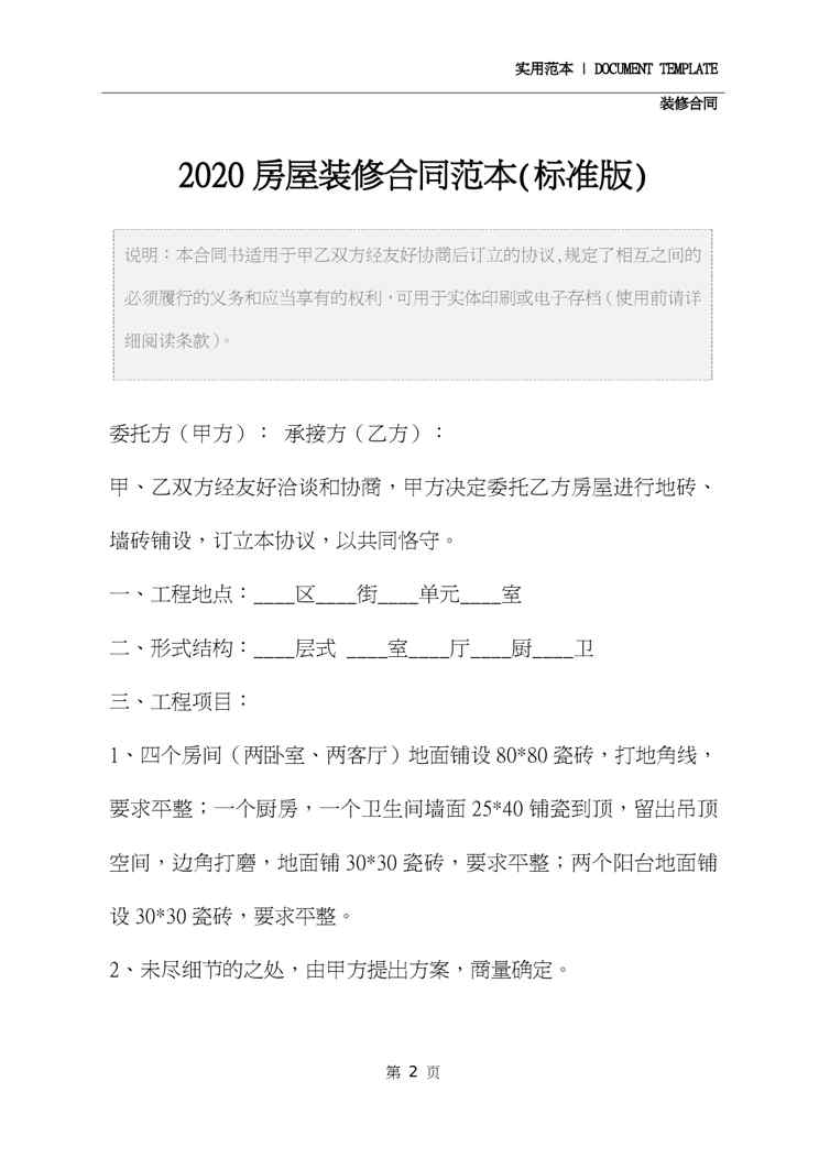不久前,最新文档《2020房屋装修合同范本(标准版)》全文正式在本站发布,感兴趣的用户可以下载阅读。 声明:本站所有文章,如无特殊说明或标注,均为本站原创发布。任何个人或组织,在未征得本站同意时,禁止复制、盗用、采集、发布本站内容到任何网站、书籍等各类媒体平台。如若本站内容侵犯了原著者的合法权益,可联系我们进行处理。