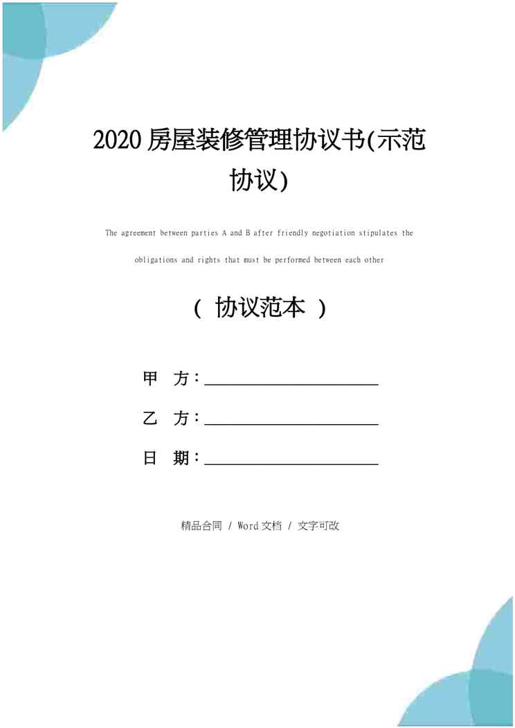 本站正式发布了《2020房屋装修管理协议书(示范协议)》文档,文档详细内容可下载阅读。 声明:本站所有文章,如无特殊说明或标注,均为本站原创发布。任何个人或组织,在未征得本站同意时,禁止复制、盗用、采集、发布本站内容到任何网站、书籍等各类媒体平台。如若本站内容侵犯了原著者的合法权益,可联系我们进行处理。