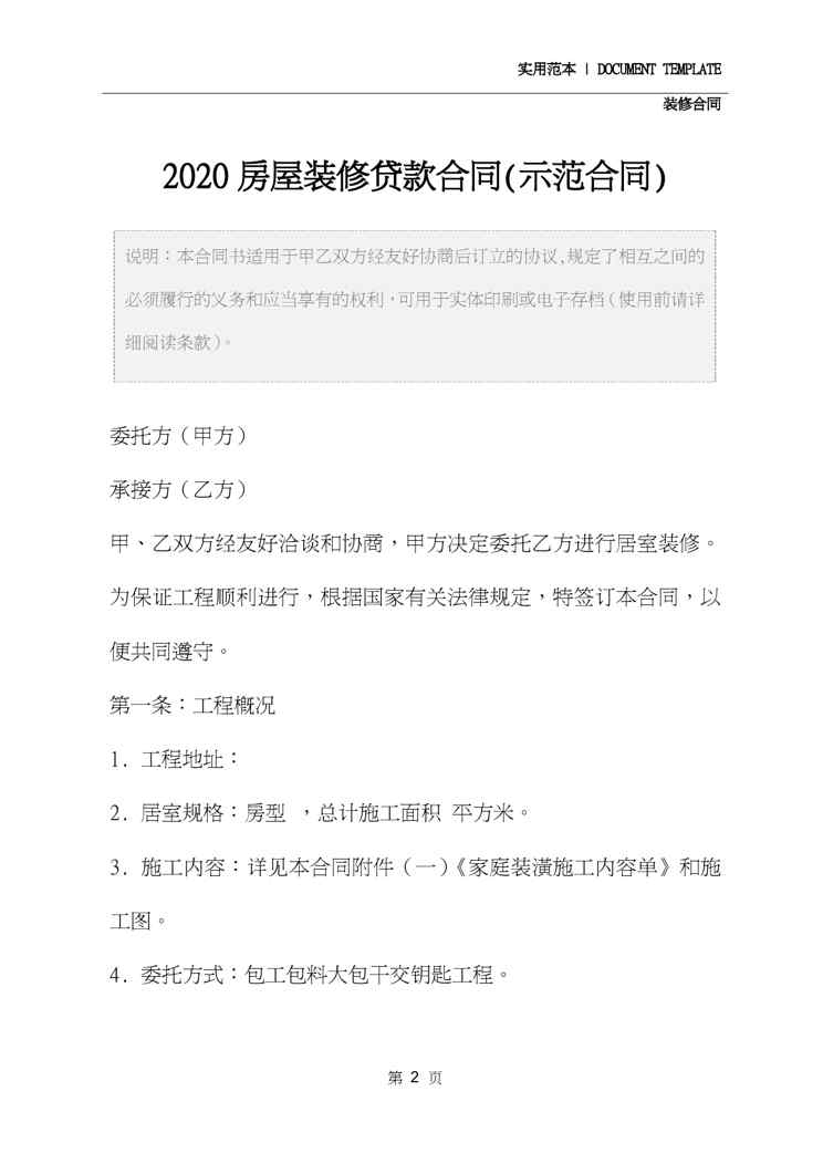 本站资深用户发布了最新的《2020房屋装修贷款合同(示范合同)》文档,以下内容为预览,详细内容可下载阅读。